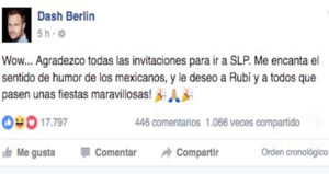 El DJ holandés Dash Berlin publicó en su cuenta de Facebook un mensaje alusivo a los XV años de Rubí Ibarra que se festejarán el día de hoy en San Luis Potosí. El productor escribió a través de sus redes sociales que había sido invitado a la celebración que se